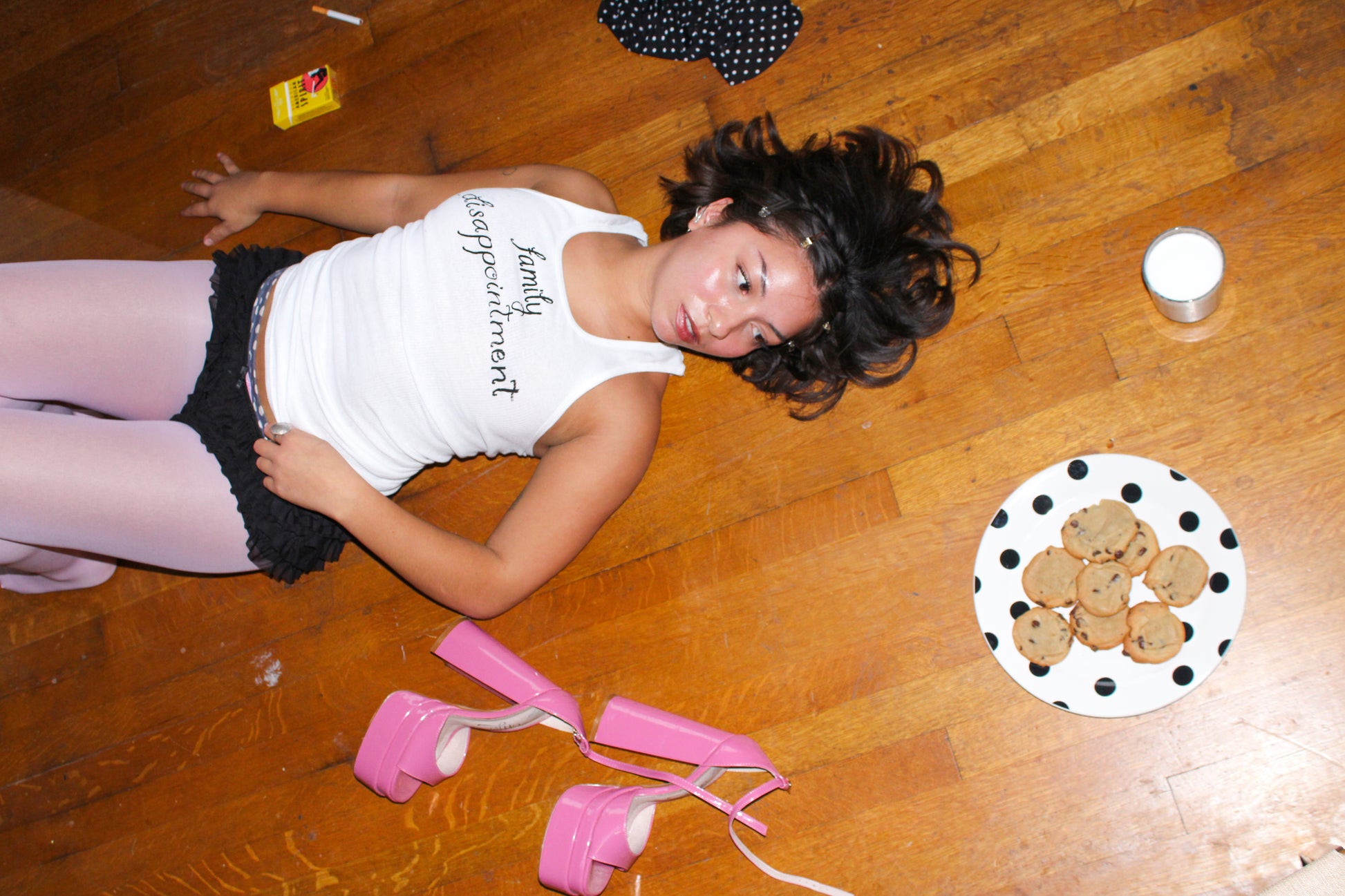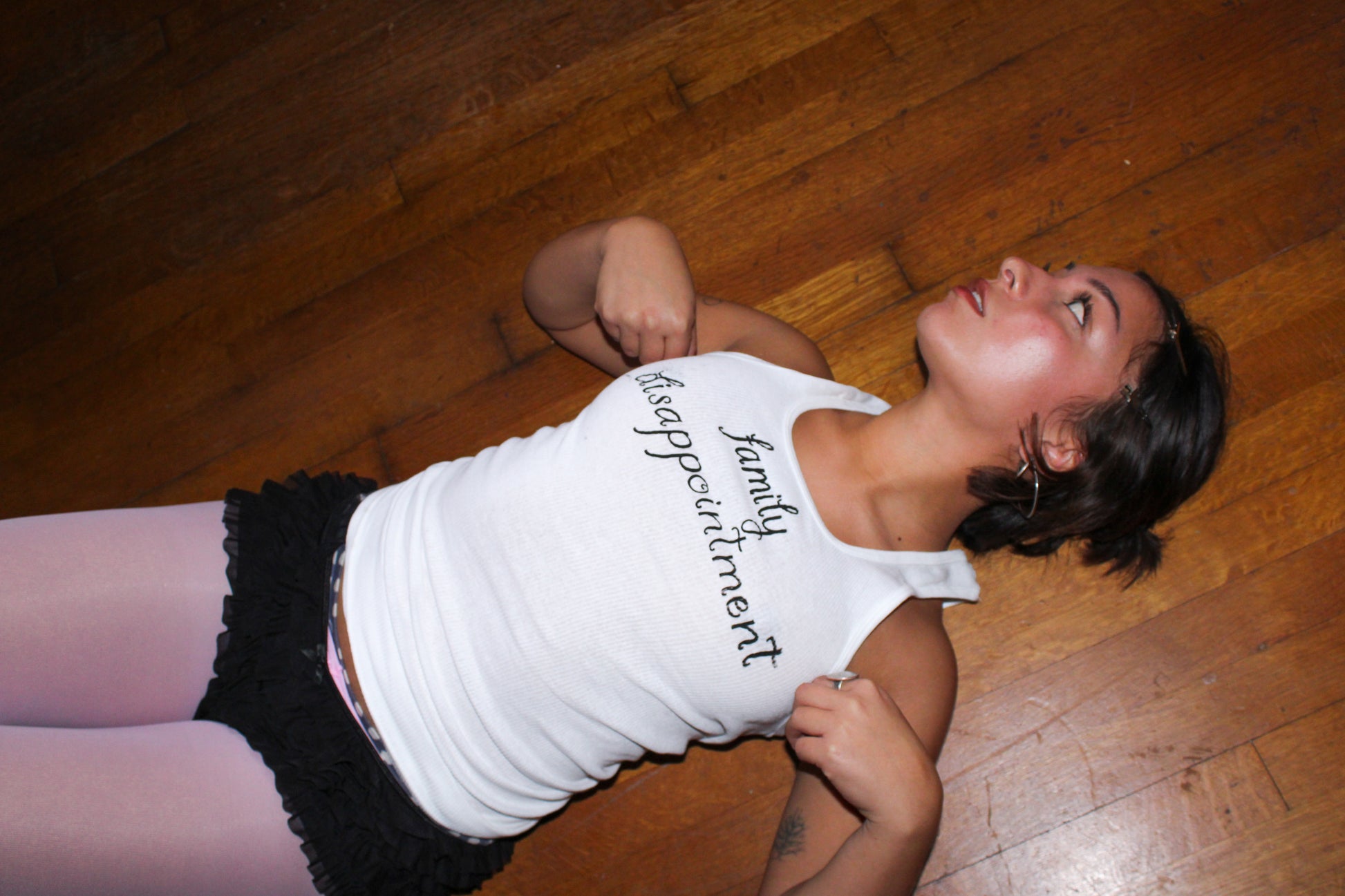 A soft cropped ribbed tank printed with the phrase family disappointment in a quiet cursive. The kind of lettering that looks sweet from far away and then hits different up close. Each piece is printed by hand, giving every tank a small, intentional irregularity that adds to the mood.